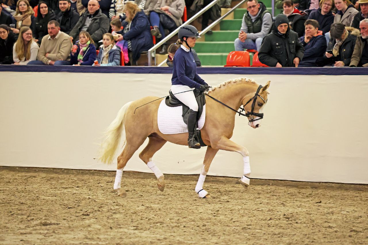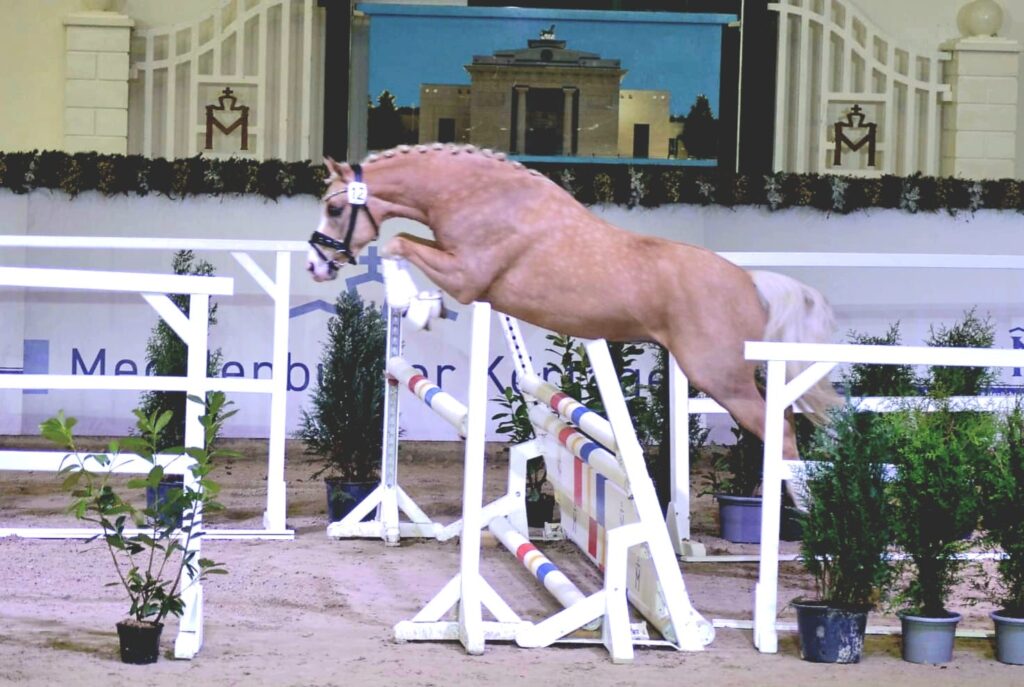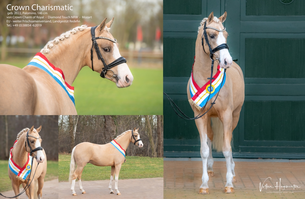 Ein Ponyhengst zum Verlieben – mit einer riesen Portion Ponycharme, Ponytyp und Ausstrahlung, trabt er sich in alle Herzen … Dieser strahlend schöne Palominohengst glänzt mit überragendem Bewegungspotential in allen 3 Grundgangarten, stets locker und bergauf mit aktiver Hinterhand vorgetragen. Auch am Sprung kann er mit Technik und Vermögen überzeugen. Überzeugend auch sein hervorragendes Interieur – Crown Charismatic ist immer freundlich, arbeitswillig und dem Menschen zugewandt. So wünscht man sich ein Reitpony! All seine Qualitäten werden durch seine hochinteressante Abstammung über Generationen abgesichert.